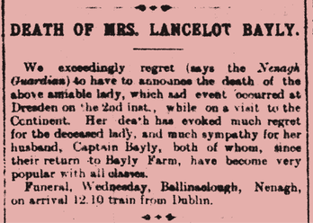 On 07/03/1907, the well travelled Lancelot now 37, married the 26 year old Kathleen Josephine Drake at Woolcot Park in Bristol. She was the daughter of a British Army Major. Sadly Kathleen died 02/04/1911 in Dresden. Her body was repatriated to Ireland and was buried in Ballinaclogh.