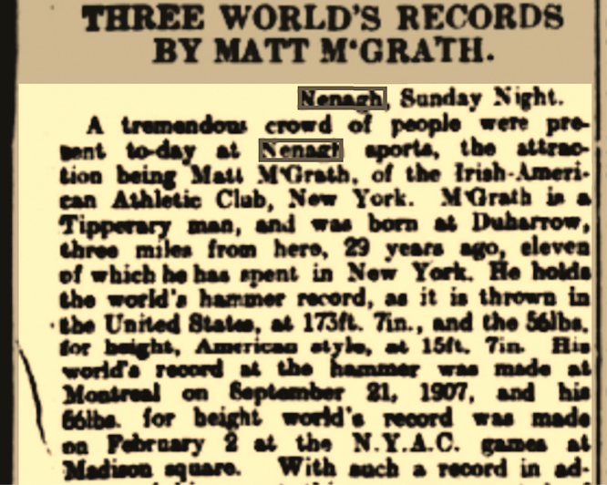 Matt also visited Nenagh in 1908. On the 9th of August, from a 9 foot circle he threw the hammer a staggering 176 feet. The measurement was certified by Robert P. Gill, from Fattheen, Puckane, a local Civil Engineer and Surveyor for North Tipperary. At this exhibition was also J.J. Hayes, fellow Olympian and winner of the controversial Marathon at White City.