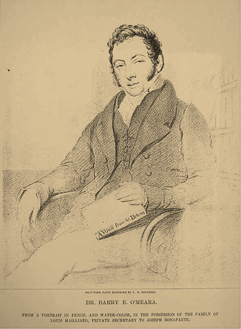 This is where Barry seized the opportunity. Napoleon was impressed by the young Irishman’s command of and fluency in both Italian and French and requested he accompany him as a medical attendant. The O’Meara name would not have been unknown to Napoleon as two of that surname were Colonels in his army, Thomas and Guillaume (William), the latter had been gazetted a Baron of the French Empire. Both were descended from the O’Meara’s of Bawn, Nenagh.