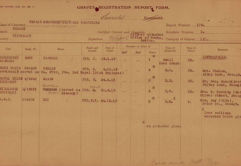Perhaps Fred knew himself that he was ill and seized on the opportunity to be away from his family during his illness. In any case Frederick died 24/12/1916 in Waterford Military Hospital of Carcinoma of the liver. His body was returned to Nenagh by Rail and moved to St Mary’s C.O.I. draped in a Union Jack. Fred had been a popular man. All available troops were rounded up to make sure Fred had the fitting Funeral Cortege that he deserved. His gravestone in Barrack St, Nenagh records a simple “Well done”.